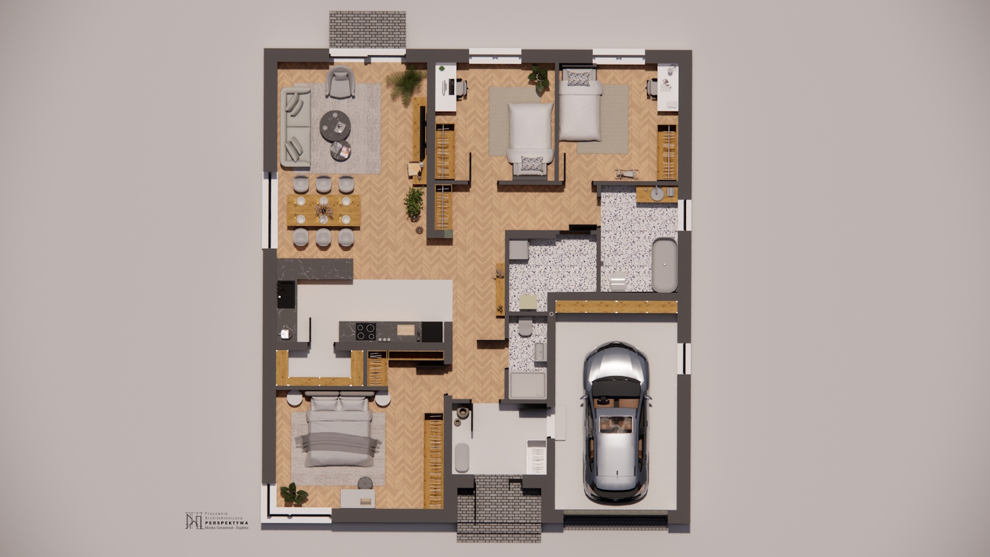 Każdy dom o powierzchni użytkowej 132 m² został zaprojektowany tak, by zapewnić maksymalną wygodę mieszkańcom. Przemyślany układ funkcjonalny obejmuje: